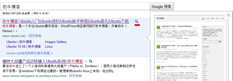 google用户应该都发现了,google已经推出了网页预览Google Instant Preview的功能,在google提供的搜索页面上,网址旁边多了一个放大镜,只要在上面点击就可以看到该网站的内容缩略图,灰常实用的说。google在搜索引擎的用户体验上奶牛感觉下了很大的功夫,从前阵子的图片模式到了现在的网页预览功能,google正在向更为人性化的方向发展,ok,上个图,大家看看效果~~~