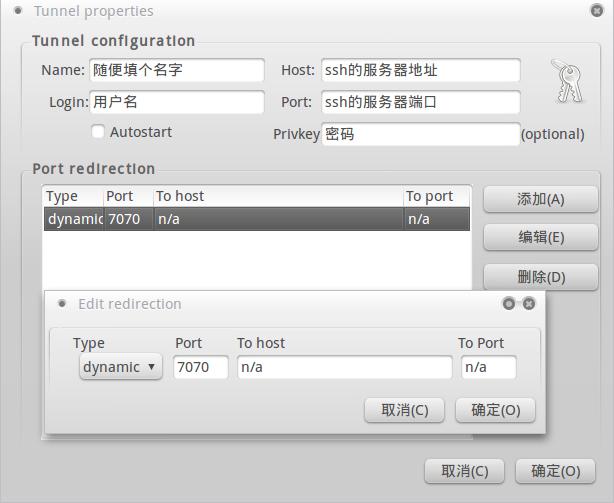 当上方的基本信息都填完毕后,点击添加来田间端口信息,一般用动态的就可以了,选择dynamic ,本地监听端口是7070默认就好了,当然根据自己的需要改下也可以。确定,链接,ok~