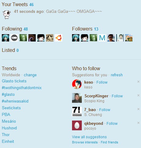 这个是新版本twitter的右侧,显示着我们twitter的基本信息,也是非常的简明扼要,有我们推过多少,多少人fo我们,我们fo多少人。