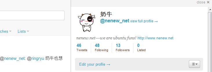 新版本可以快速滴查看一个mention到的人的信息,例如只要在@nenew_net上点击一下就可以看到如下小牛推特的信息了。