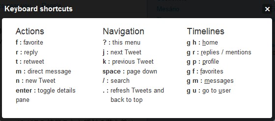 新版本twitter还有很多快捷键哦,下面这张图有具体的介绍,如n:new Tweet ,只要按下键盘的N就可以发新信息了,灰常方便~~~