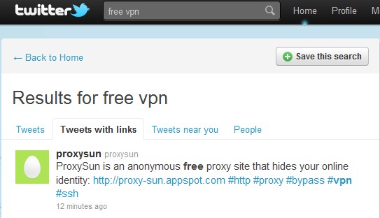 前阵子google的即时搜索灰常火热啊,说这个即时搜索无非也就是搜索twitter上的近期信息,我们借助新版本的搜索功能完全可以实现,例如我们搜索free vpn,可以找到很多最新发出的推特信息,而且我们还可以选择我们需要的类型,如带连接的Tweets with links。