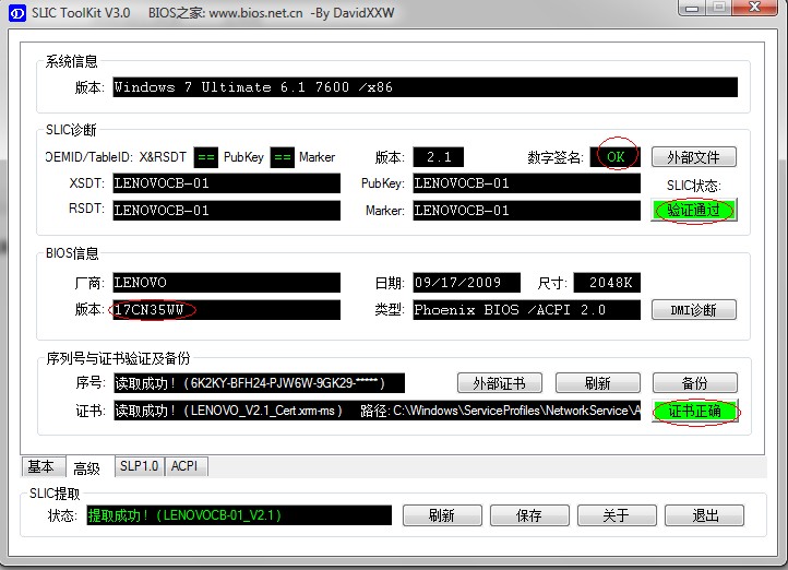 如果你所用的全新安装镜像不是oem镜像或者你是升级安装的话,安装完成后用SLIC ToolKit检测可能无法检测到证书,这时我们就需要手动导入证书咯。运行U盘内的Win7_OEM证书序列号导入工具v2.0,然后输入J导入Lenovo的oem信息到我们的小Y里,然后会有提示说导入证书成功,这时你用Slic ToolKit查看下高级中是不是所有的选项都变成绿色的了呢,哈哈,恭喜你咯,享受你的win7正版旗舰版吧~~~