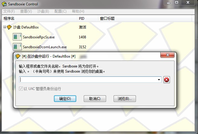 那么程序呢,程序在沙盘中运行也很简单。打开右下角的沙盘图标,从工具栏的沙盘——进入default sandboxie——运行任意程序,就会打开如图所示界面: